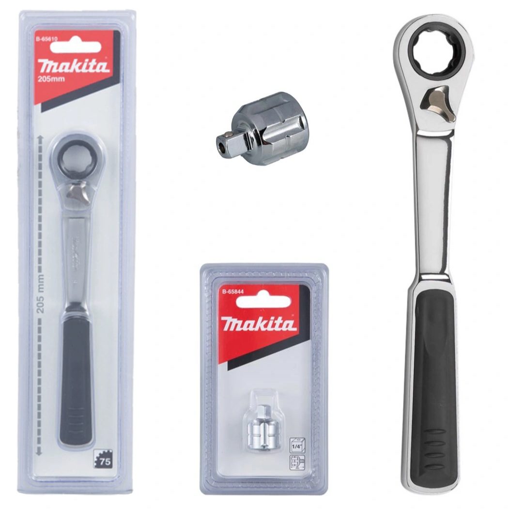 دسته جغجغه ماکیتا با تبدیل درایو 1/4 اینچ که با این تبدیل میتوانید به عنوان دسته بکس نیز از آن استفاده کنید ابزاری با کیفیت برای دوستانی که نیاز به دسته جغجغه یا دسته بکس برای جعبه بکس با درایو ¼ دارند بسیار با کیفیت هست و تبدیل با درایو های متفاوت آن و همچنین بکس های متفاوت برای این دسته در بازار موجود هست که فقط کافیه دسته جغجغه را یک بار تهیه کنید و تبدیل های متفاوت آن را برای دسته جداگانه تهیه کنید.